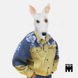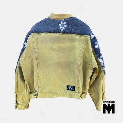 Veste en jeans Upcyclée de seconde main customisée une couverture de récupération.